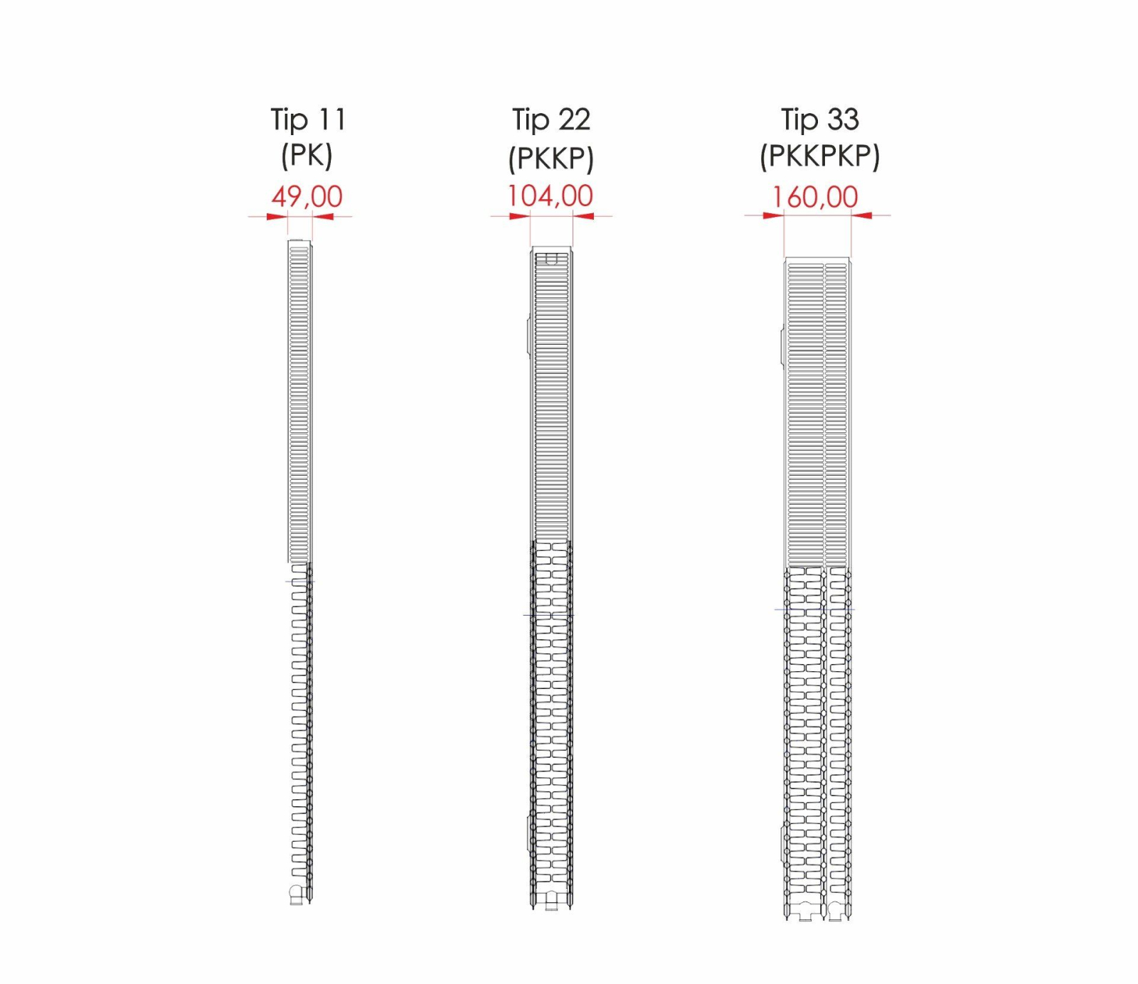 - 18 lungimi diferite, de la 400 mm la 3000 mm - pentru tipul 22; 13 lungimi diferite, de la 400 mm la 2000 mm - pentru tipurile 11 si 33