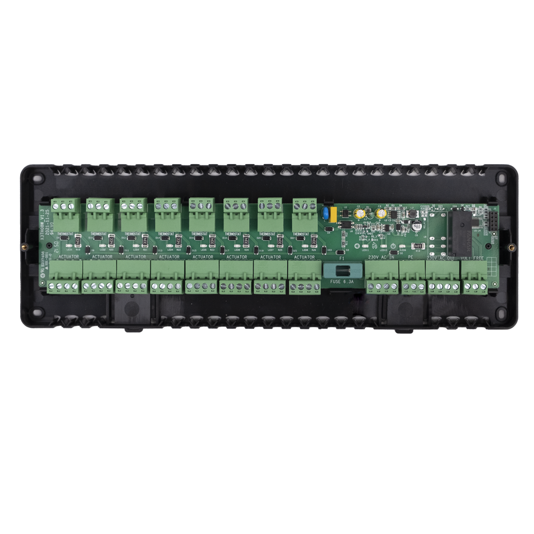 Bară centrală pentru controlul încălzirii de suprafață (8 zone). Permite conectarea convenabilă a regulatoarelor de temperatură cu fir și a actuatoarelor. Bara are un modul de control încorporat pentru unitatea de încălzire și pompa de circulație. ECB08M230 reglează temperatura ambiantă prin blocarea sau deschiderea debitului prin buclele de încălzire cu ajutorul unor actuatoare termoelectrice conectate cu bară, montate pe distribuitor.