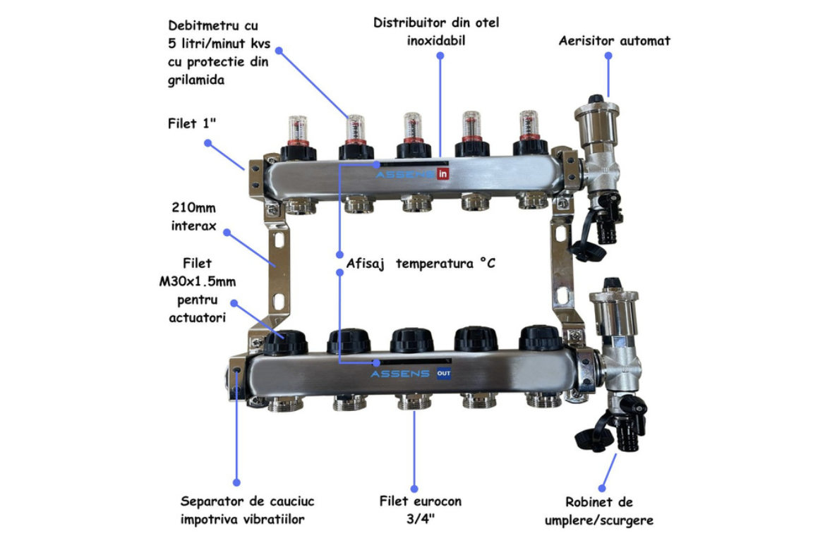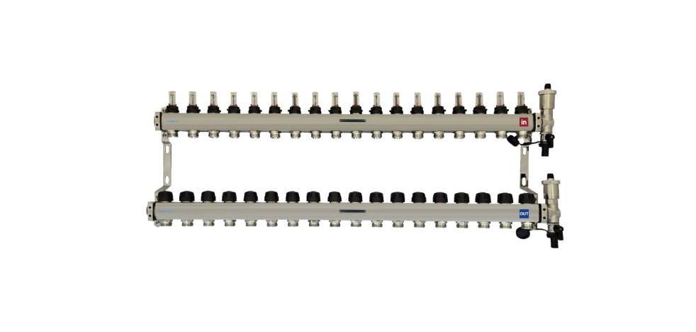 Distribuitor cu 12 circuite din inox 1”-3/4” EK cu suporti montaj 210mm si kit golire/aerisire automata