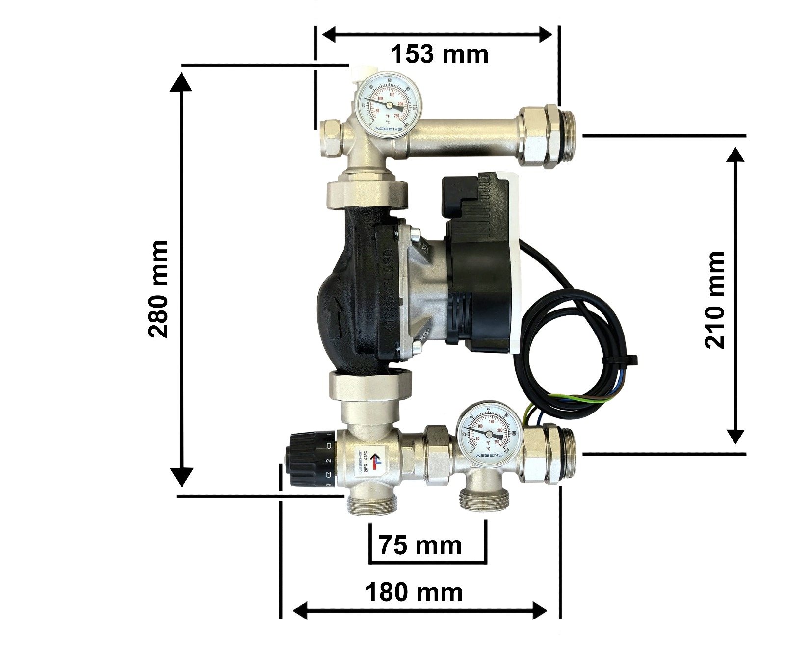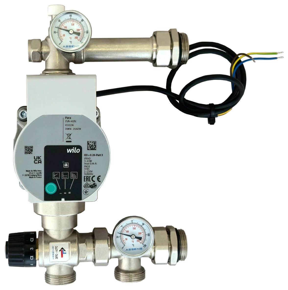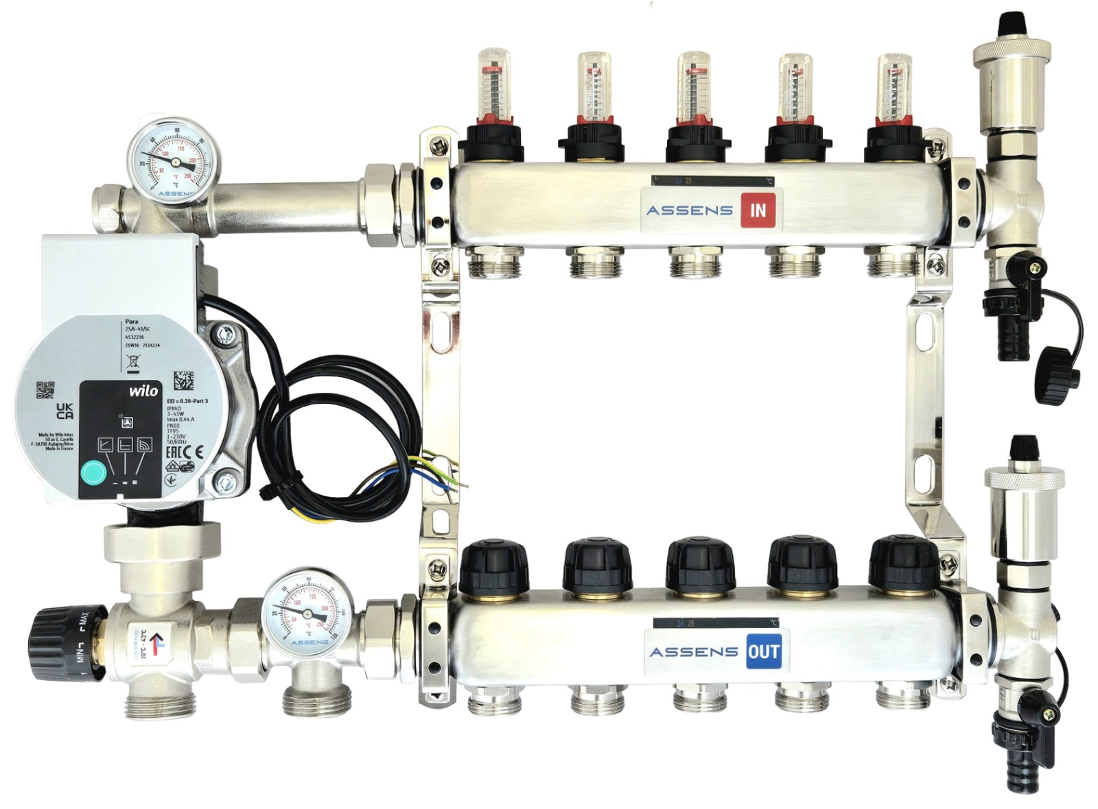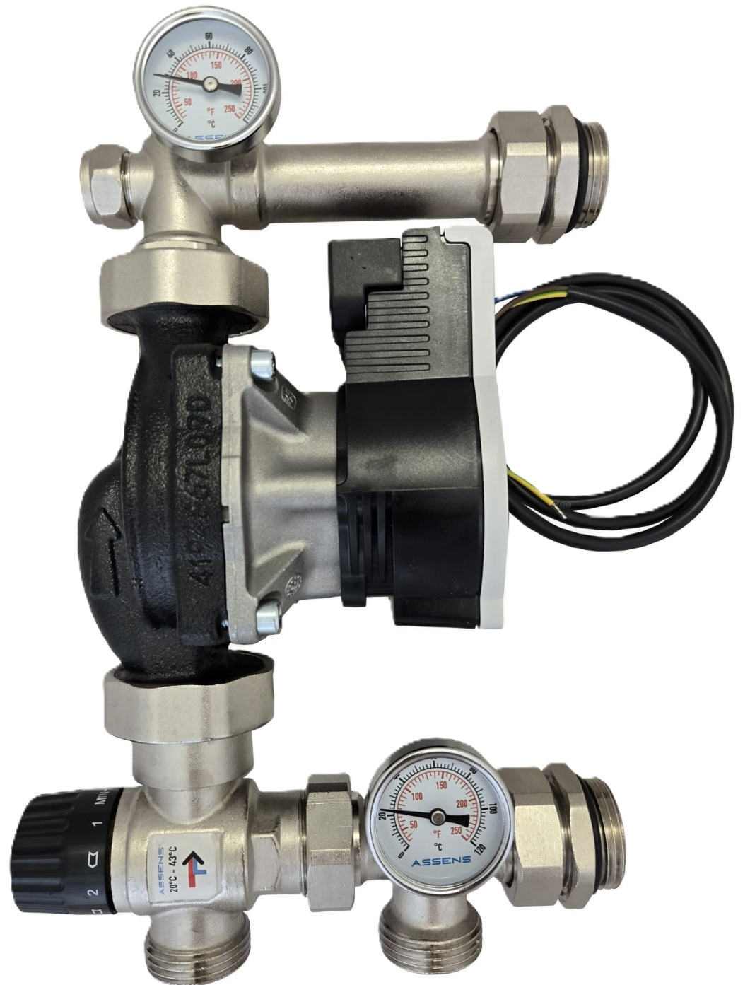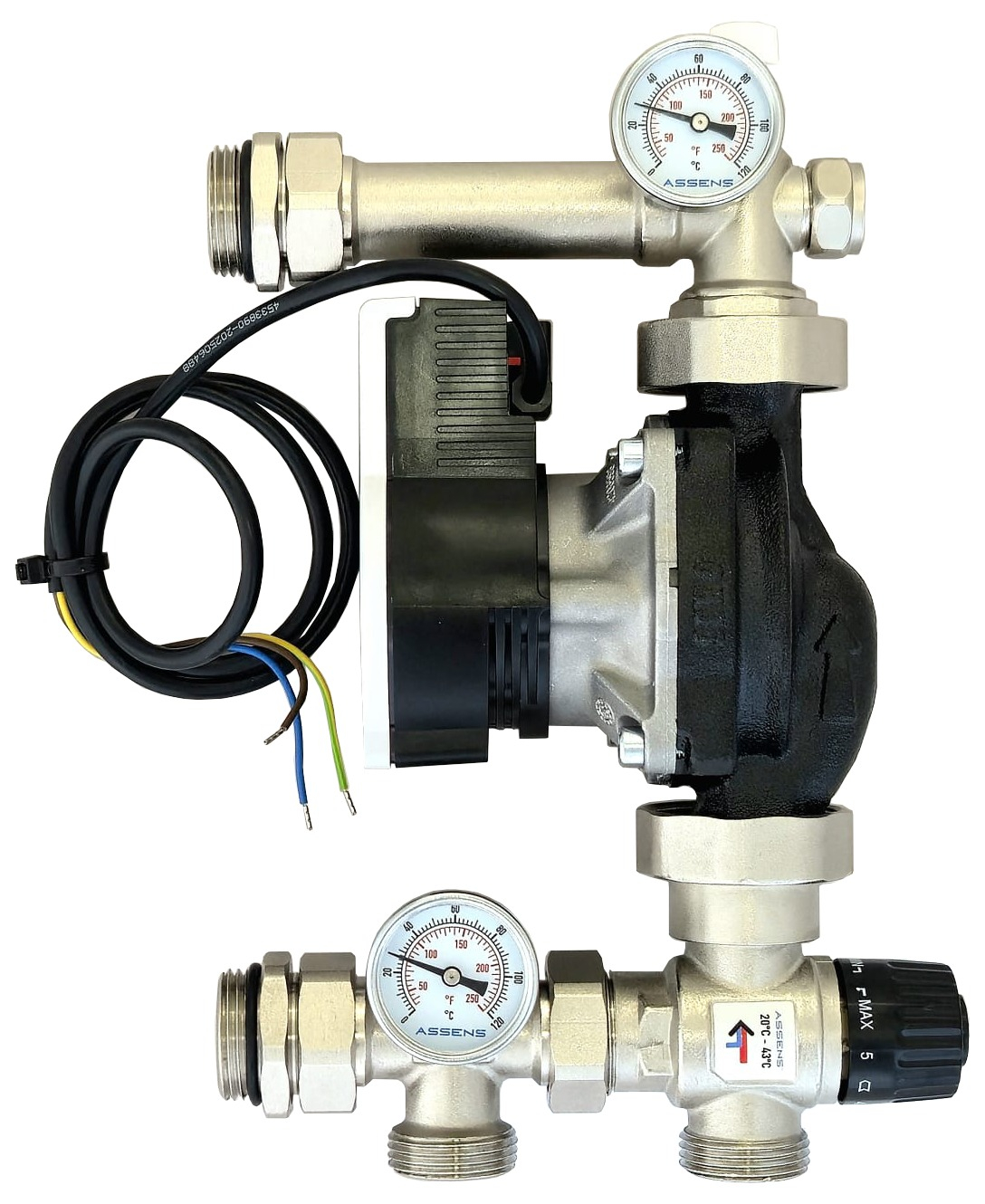 Grupul de pompare ASSENS a fost dezvoltat pentru a optimiza incalzirea in pardoseala cu solutii inovatoare. Utilizarea sa este prevazuta pentru sistemele de incalzire prin pardoseala la temperaturi joase. Conexiunea de amestec la sistemul de incalzire se realizeaza prin conexiuni paralele direct in vana cu trei cai, care permite circulatia fluidului termic provenit din circuitul primar, mentinand temperatura la o valoare prestabilita (temperatura fixa) cu ajutorul unei vane de amestec cu element termostatic. Se utilizeaza in general la sistemele de incalzire prin pardoseala. Grupul poate fi instalat impreuna cu distribuitoarele de incalzire prin pardoseala montat in dreapta sau in stanga. Montajul pe conductele de tur permite instalarea grupului intr-o pozitie perfecta si cuplarea la distribuitoare cu distante interaxiale de 210mm.